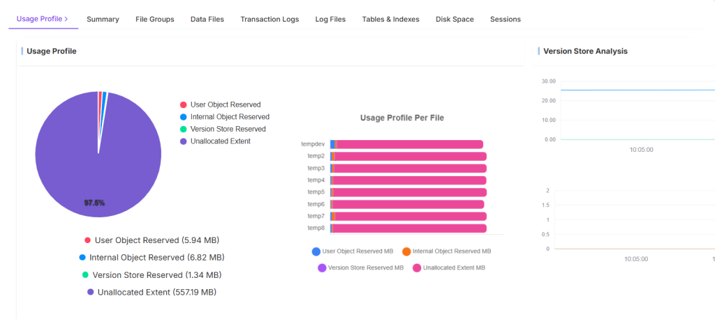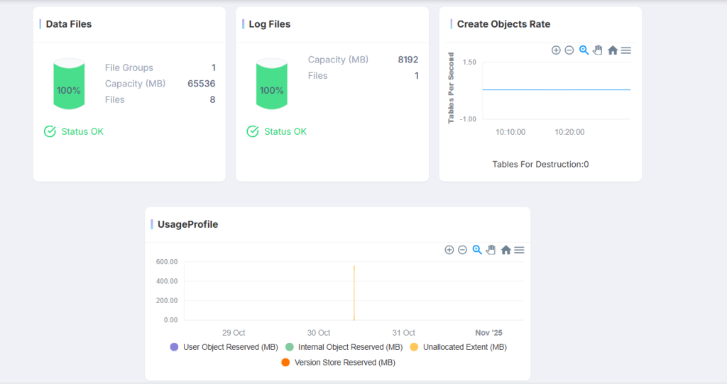 Resource monitoring is critical. The system tracks the utilization of Data Files and Log Files, indicating the usage percentage against their allocated capacity. Capacity alerts (such as the 100% indicator shown) are paramount for preventing outages caused by running out of disk space. Furthermore, these tools track the object creation rate (e.g., tables per second) to measure development or maintenance activity on the database. They also maintain a history of the usage profile over time to detect abnormal spikes, which is crucial for troubleshooting past events.